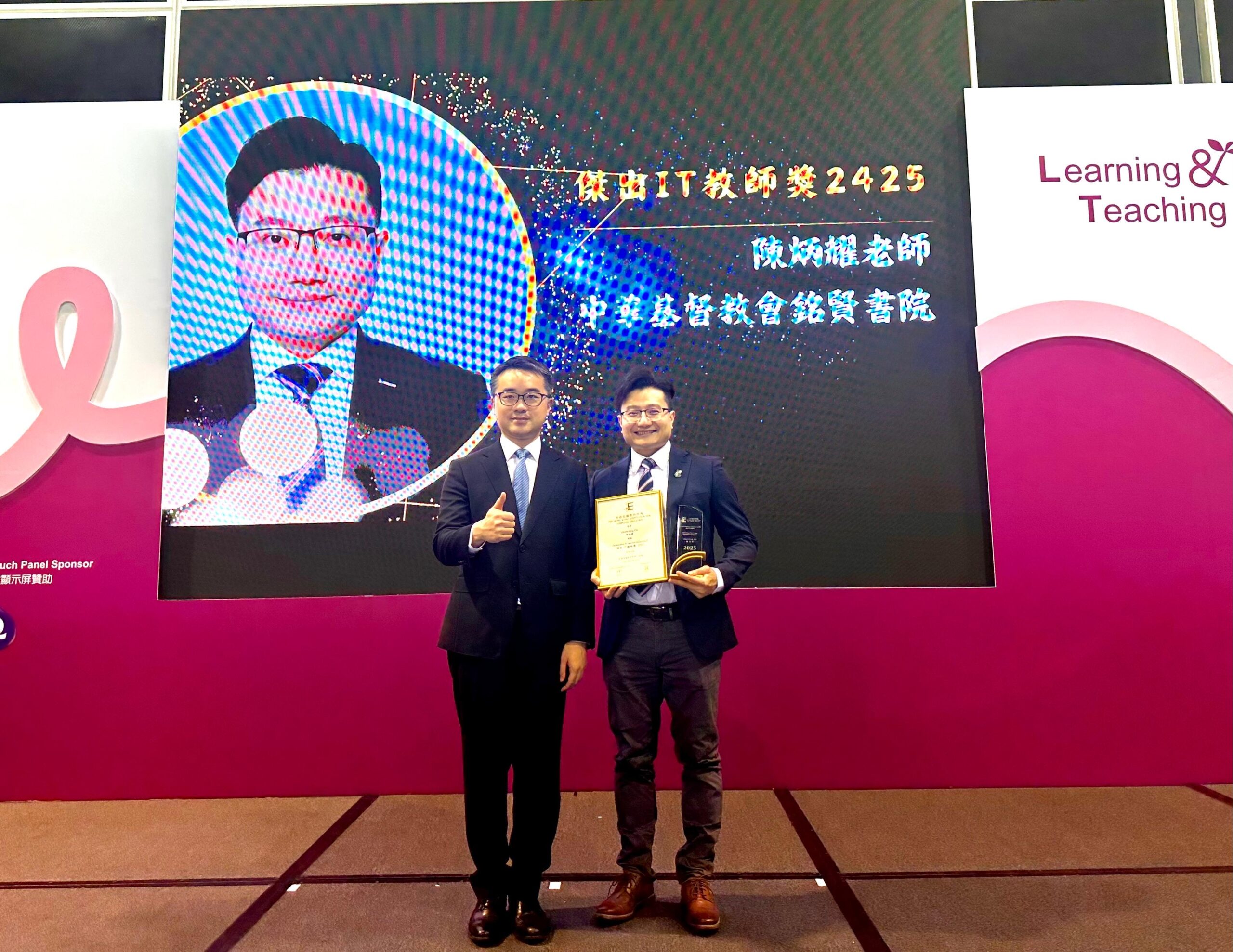 校政與專業發展方面,我們把AI應用於數據整合、學習回饋與文件流程,盡量把時間還給課室與學生關顧。這條路上,老師團隊以行動詮釋「專業就是持續的愛」:多年來定期舉辦AI教師培訓與校內外工作坊,於教與學博覽等平台持續擔任講者,公開分享實證經驗——如何用數據與AI了解學生多元智能、識別強弱項、訂立個別化目標;如何把弱項變成進步的路線、把強項轉為自信的基石;如何把行政流程數碼化,釋放更多時間回到師生關係與高質回饋之上。老師亦與大學夥伴共同開展多項創新AI專案,讓研究走進課室、讓課室反饋研究,推動校本與學界雙向成長。基於以上長期而穩定的付出,本年度本校同工獲頒「傑出IT教師」獎項,學校以感恩領受——把榮耀歸上帝,也歸於每一位願意把週末與夜晚獻給備課、研究與分享的老師;他們的堅持,最終都會成為學生的底氣。