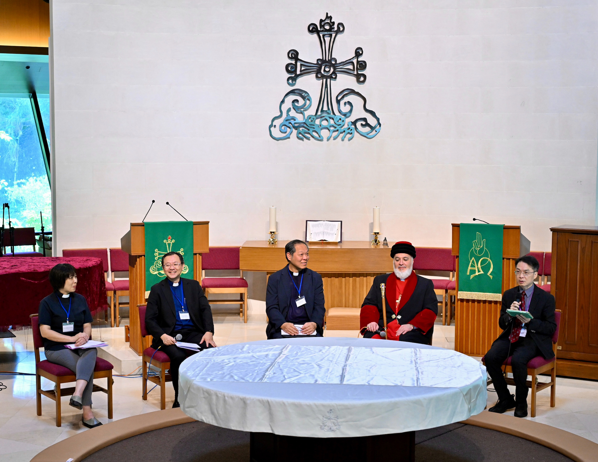 在圓桌會議上,各教會傳統的代表輪流發言(圖左至右:陳潔玲牧師、王家輝牧師、陳永超副主教、馬爾・阿瓦三世宗主教及葉菁華院長)。
