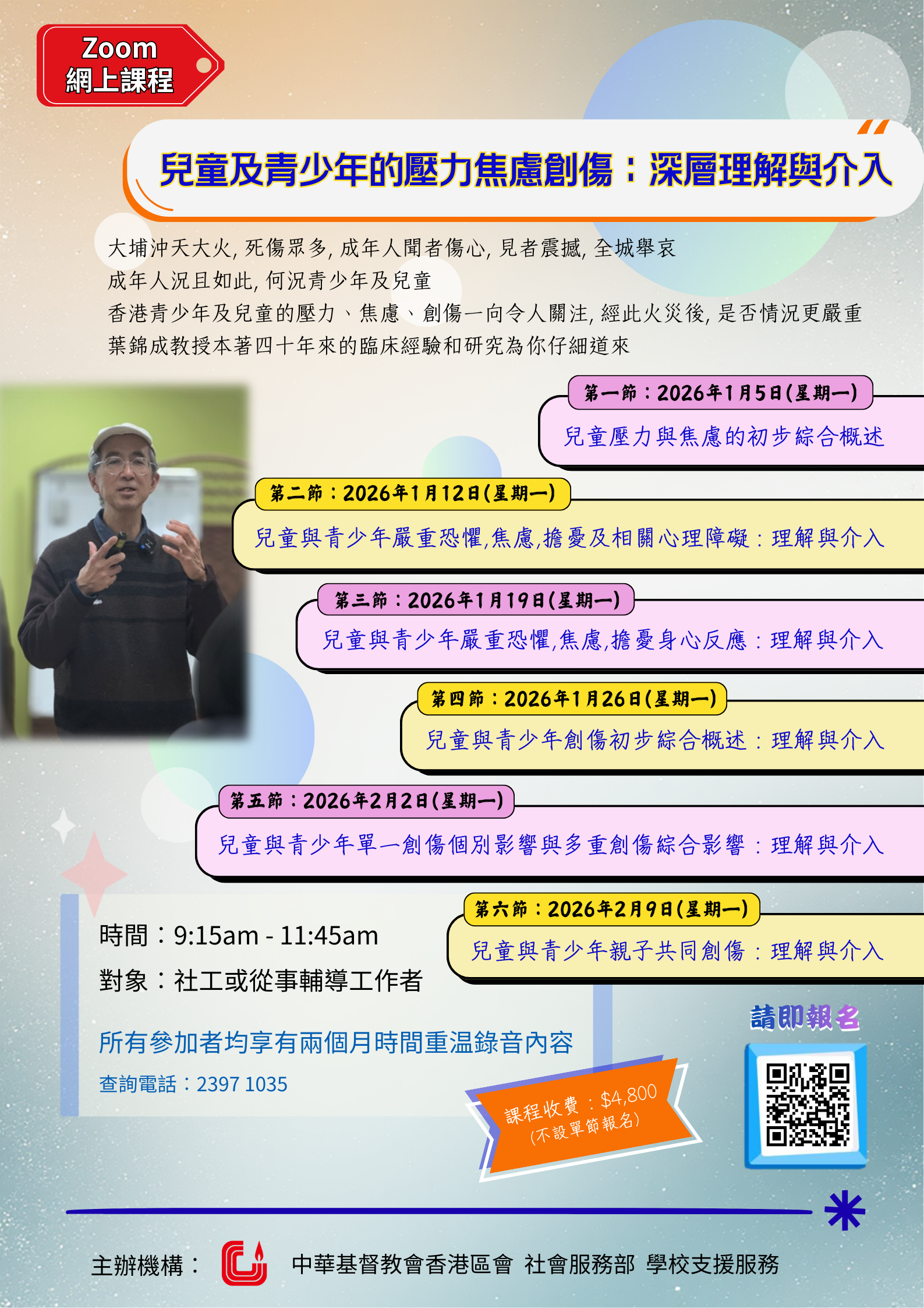 聚會活動課程課程 本會社會服務部學校支援服務與葉錦成教授合辦Zoom網上課程「兒童及青少年的壓力焦慮創傷︰深層理解與介入」 2025-12-15 872 分享 FacebookWhatsAppTwitterTelegramEmail打印 報名連結:https://forms.office.com/r/0v1DYAdgJX 兒童及青少年的壓力焦慮創傷︰深層理解與介入 – 活動海報下載 本文章於 2026-02-09 星期一 的 23:59 期滿。